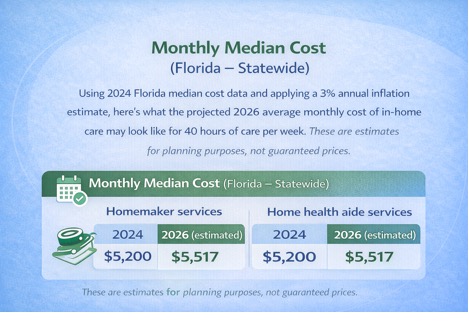 Using 2024 Florida median cost data and applying a 3% annual inflation estimate, here’s what the projected 2026 daily rates, hourly rates, and overall cost of in-home care may look like for 40 hours of care per week.